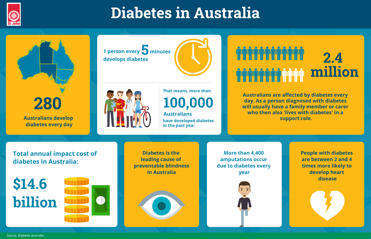 Diabetes has primary and secondary effects on those living with the condition as well as their loved ones. For every person diagnosed with diabetes there is usually a family member or friend who also ‘lives with diabetes’ every day to support. This means an estimated 2.4 million Australians are directly linked to diabetes.