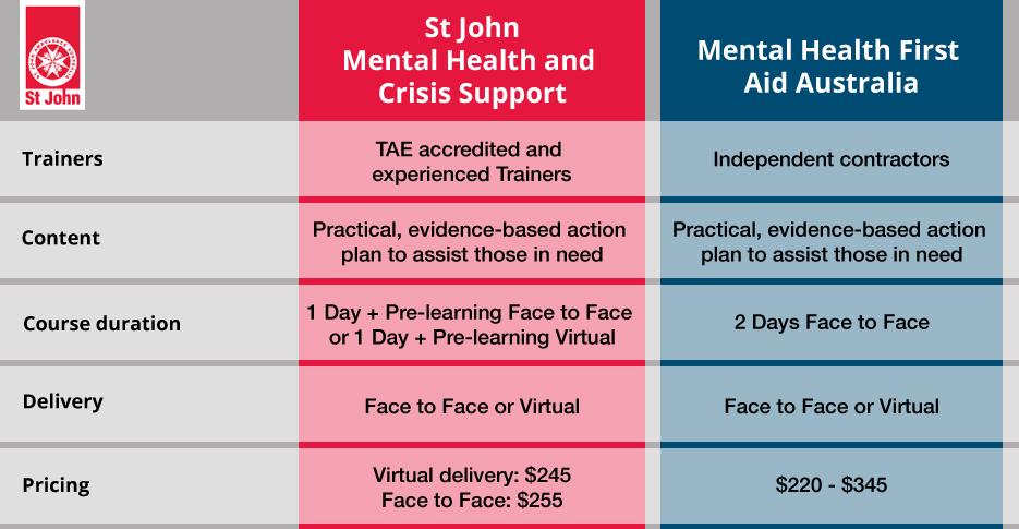 St John Victoria’s Mental Health and Crisis Support course is delivered by in-house Trainers, which means there is standard fixed pricing for courses. The price for virtual delivery is $245 and face-to-face is $255 – pricing won’t vary regardless of who and where this is delivered.