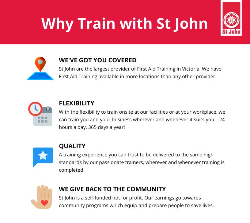 Moreover, St John Ambulance Victoria has 16 training venues across Metropolitan and Regional Victoria, meaning there is an abundance of training locations available.