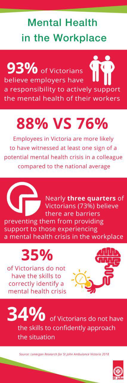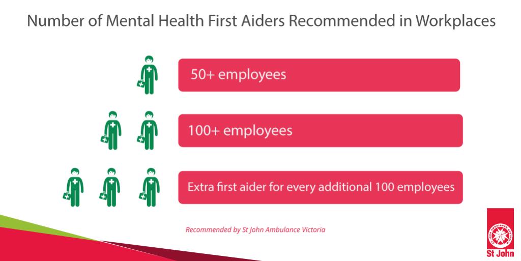 St John Ambulance Victoria recommends all Australian workplaces should undergo mental health first aid training to combat the continuous decline of Australia’s mental health status in the workforce. If your workplace consists of fifty or more employees we now advise you have at least one employee trained as a mental health first aider.