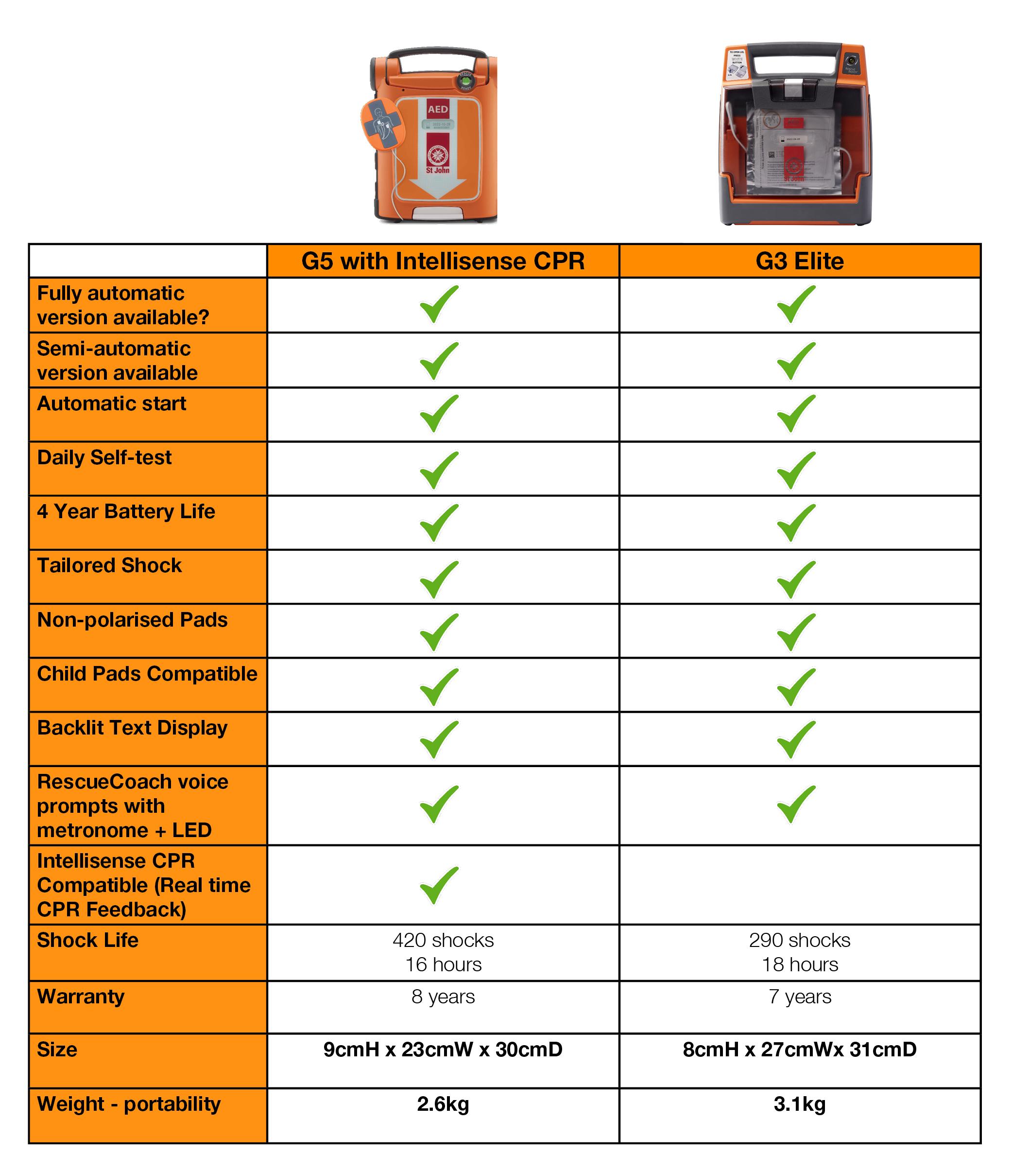 The St John Ambulance G3 Elite AED is simple, effective and ready for the rescue. The easy to use device completes daily automatic testing to ensure it's Rescue ready and guides the rescuer step by step through CPR and Defibrillation based on the level of responder experience.